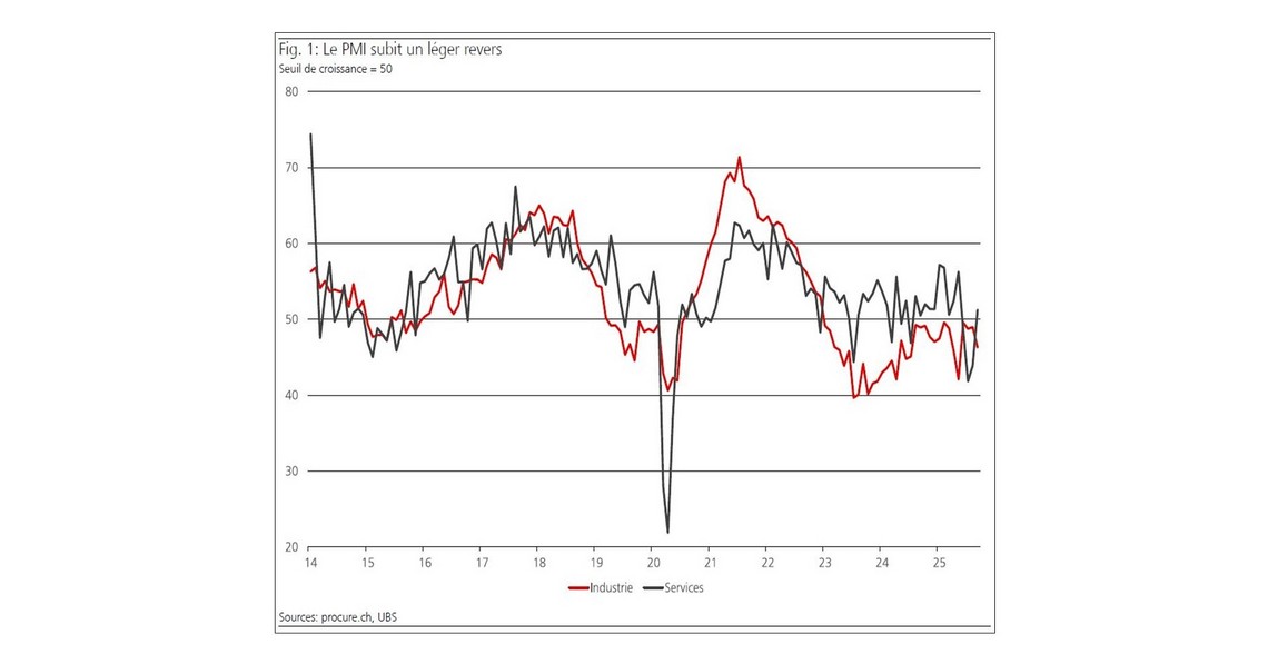 L’indice des directeurs d’achats procure.ch (PMI) a reculé de 2,7 points en septembre pour s’établir à 46,3,signalant une situation toujours tendue dans l’industrie.En revanche, le PMI des services a repassé la barre des 50 points après le repli observé durant les mois d’été.Les mesures protectionnistes pèsent de plus en plus sur l’industrie – la part des entreprises concernées a atteintun nouveau record à 47%.