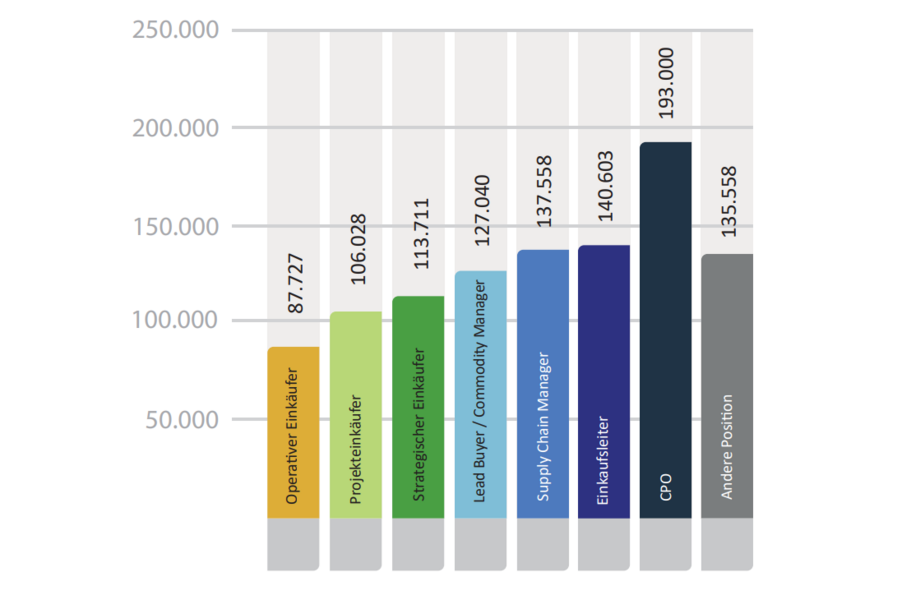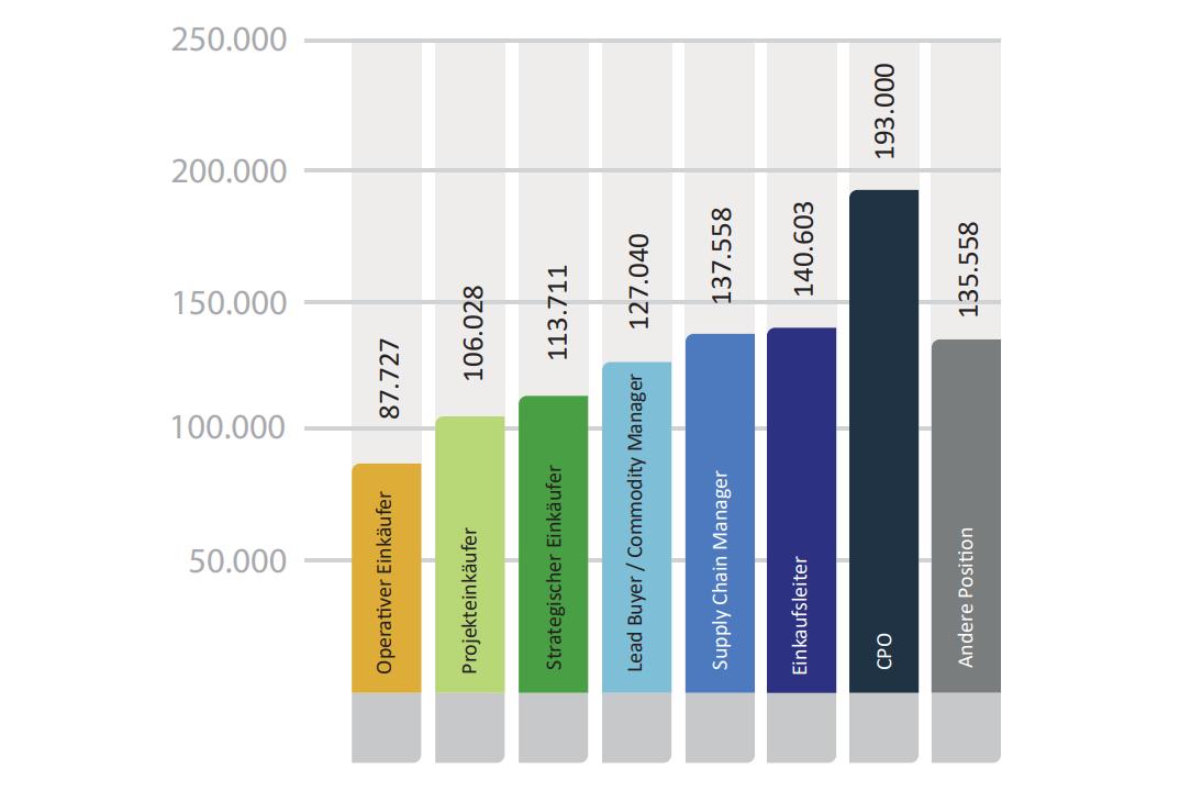 62% kaufen direktes Material ein. Investitionsgüter sind mit einem überdurchschnittlichen Gehalt verbunden – der Projekteinkauf liegt leicht darüber, Handelsware leicht darunter.
