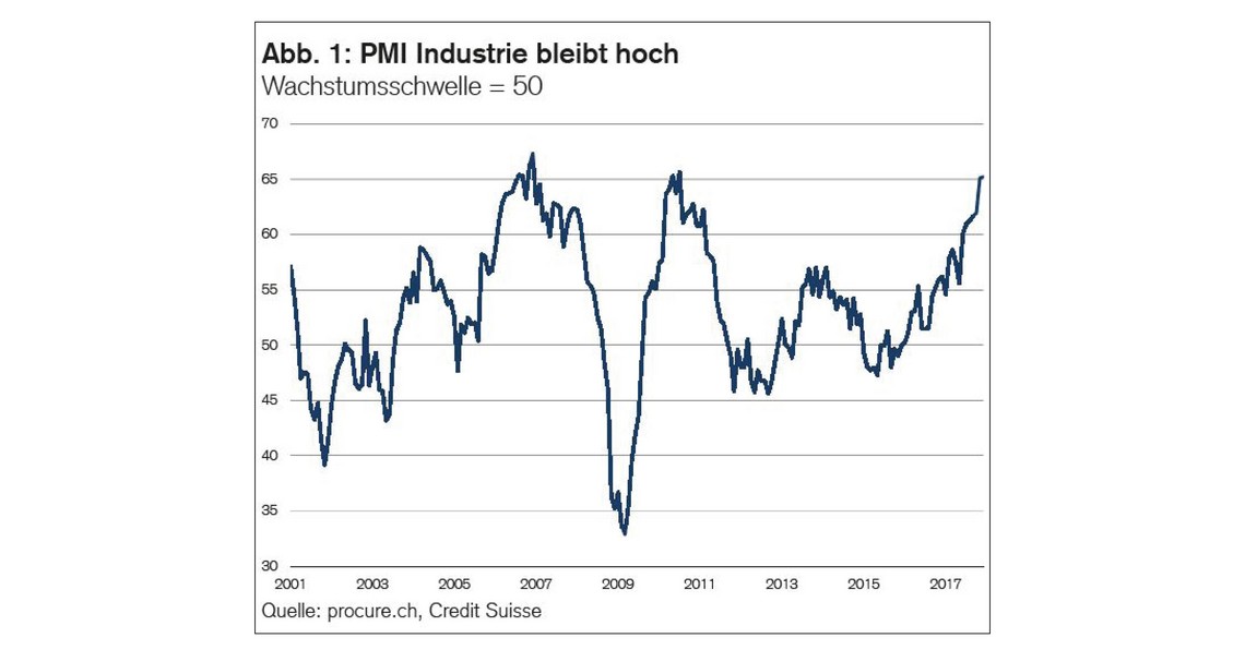 2017 lag der PMI im Durchschnitt bei 60 Punkten. Ein höherer Jahresdurchschnitt wurde nur in den Jahren 2010, 2006 und 2000 verzeichnet – allesamt Boomjahre. Der schwächere CHF und die robuste Konjunktur im Ausland wirken sich derzeit positiv auf die hiesige Industrie aus, die ihre Produktivität unter dem