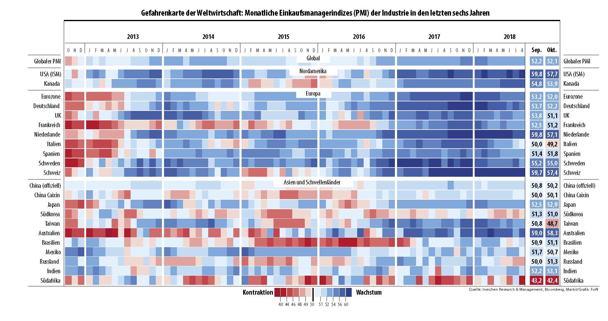 Die Frühindikatoren aus der Industrie signalisieren schwaches Wachstum in Europa und China. Die US-Konjunktur verlangsamt sich auf hohem Niveau.