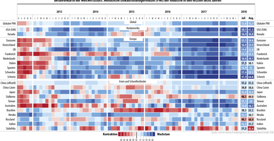 Doch die Probleme einzelner Schwellenländer kommen auch in den Einkaufsmanagerumfragen zum Ausdruck. Die russische Industrieproduktion ist demnach seit vier Monaten auf Schrumpfkurs. Südafrika befindet sich offiziell in einer Rezession, was der PMI schon seit längerem signalisiert hat. Unter dem Eindruck des anhaltenden Kapitalabflusses und der schwachen Währung ist der südafrikanische Frühindikator im August noch weiter abgestürzt. Das Gleiche gilt für die Türkei, wo der Industrie-PMI im Zuge der Währungskrise scharf gefallen ist, von 49 auf 46,4, den tiefsten Stand seit dem misslungenen Militärputsch im Sommer 2016. Das Nachlassen der Dynamik imWelthandel dürfte die exportorientierte Industrie in den Schwellenländern in den kommenden Monaten weiter unter Druck setzen.