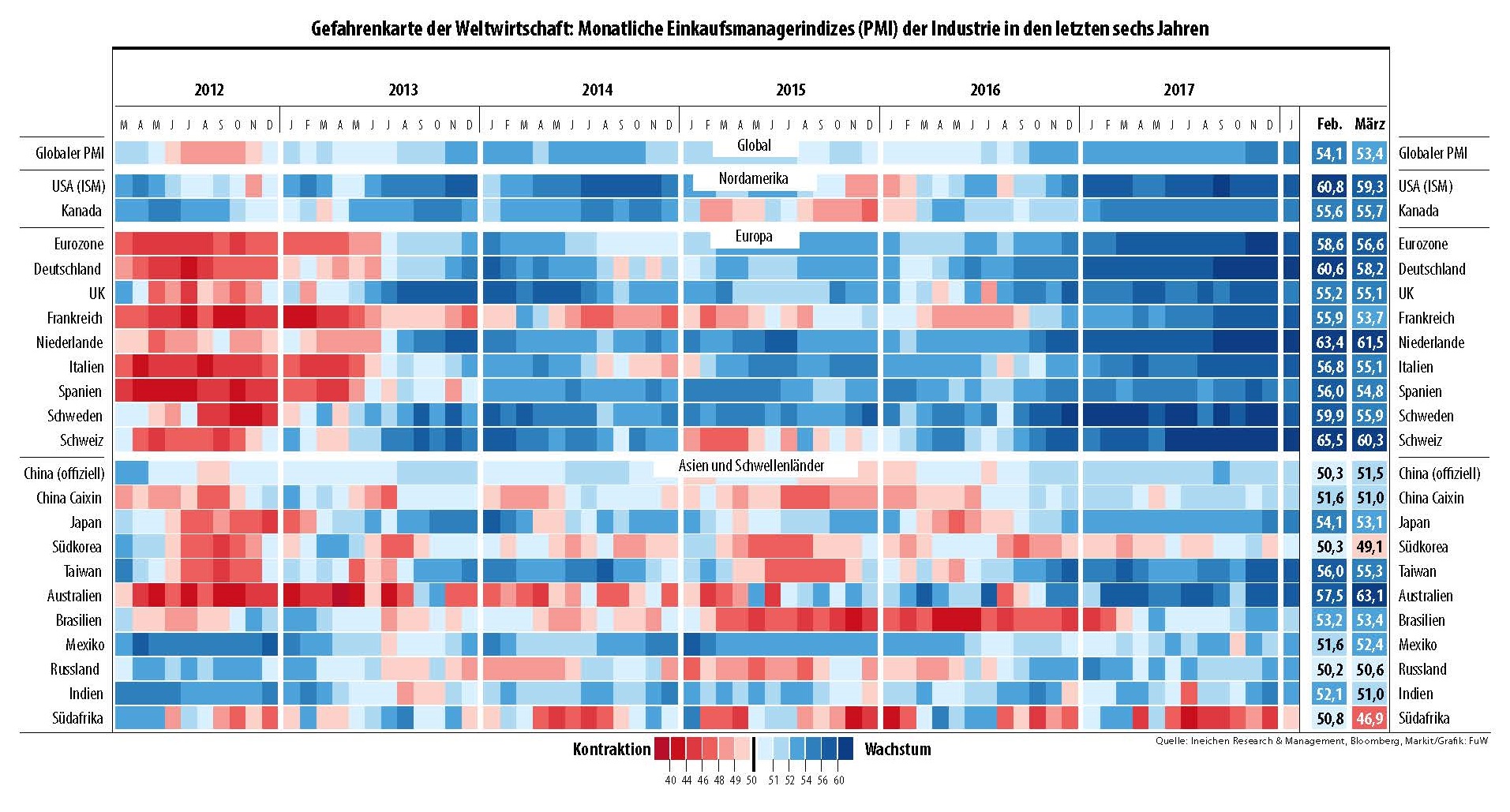 Die Weltwirtschaft bleibt auf Expansionskurs. Das Tempo hat jedoch etwas nachgelassen. Das zeigen die neusten Ergebnisse der monatlichen Industrieumfragen. In den meisten Ländern ist der daraus abgeleitete Einkaufsmanagerindex (Purchasing Managers Index, PMI) im März gesunken.