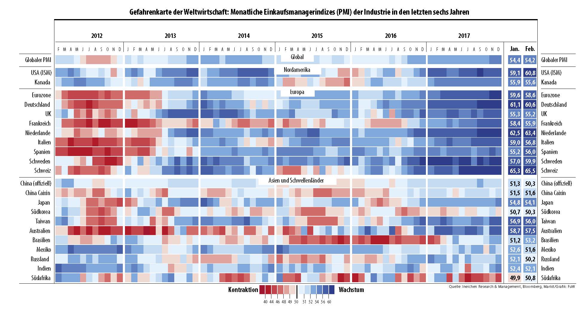 Werte über 50 signalisieren eine wachsende Industrieproduktion, Werte darunter einen Rückgang der Aktivität. In allen grösseren Volkswirtschaften liegt der Industrie-PMI nun über der Wachstumsgrenze. So einstimmig positiv waren die Umfrageergebnisse seit 2010 noch nie. Doch es gibt Nuancen. So haben sich die Frühindikatoren in Europa tendenziell von einem hohen Niveau aus verschlechtert, während aus China widersprüchliche Signale kommen. Die US-Industrie hingegen kennt kein Halten mehr.