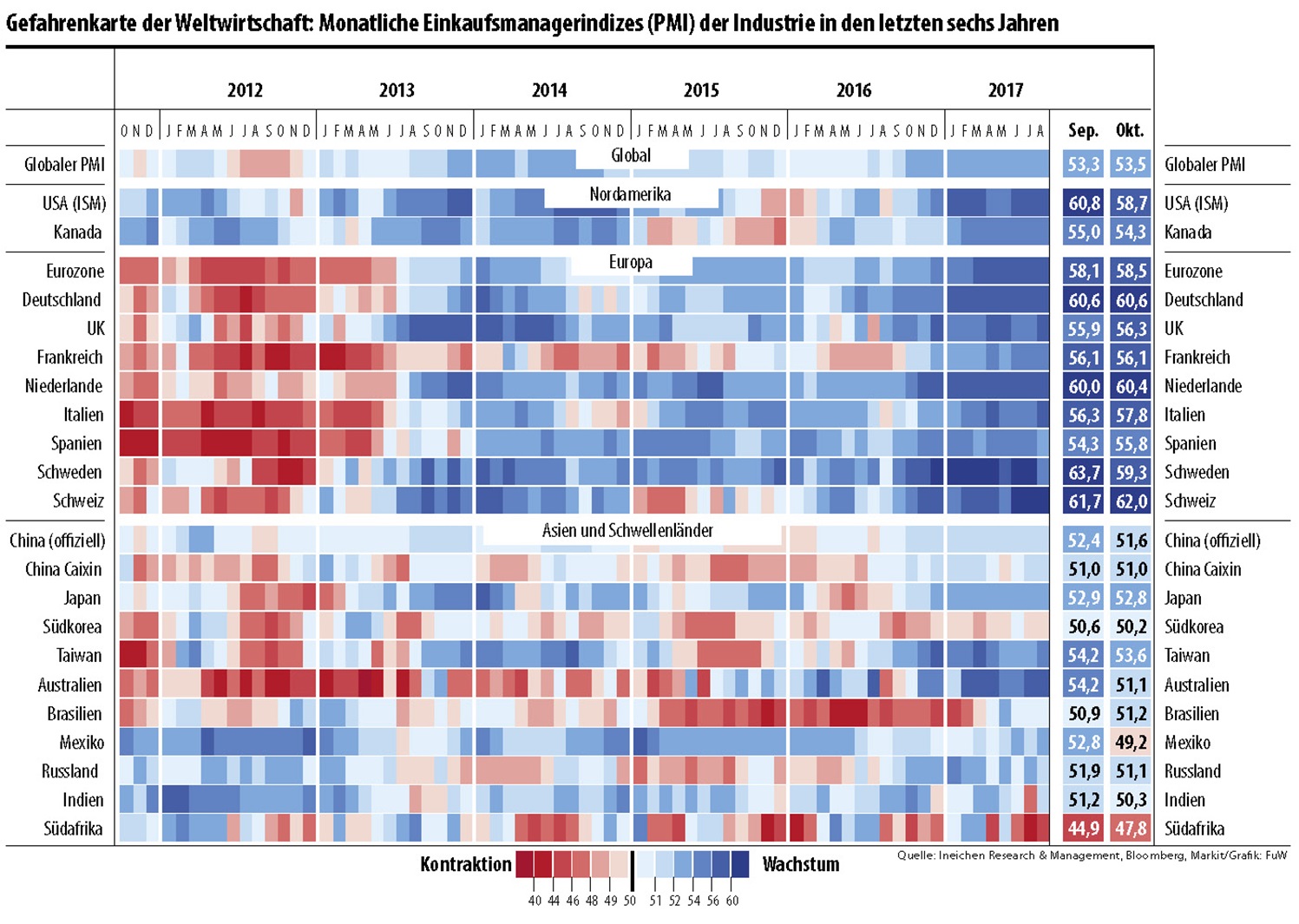 Der globale, nach Wirtschaftskraft ge wichtete Einkaufsmanagerindex (Purchasing Managing Index, PMI) von J. P. Morgan ist im Oktober auf 53,5 gestiegen, das höchste Niveau seit 2011. Das ist zum einen dem Boom in Europa zu verdanken. In der Währungsunion dürfte sich das Wachstum zum Jahresende sogar nochmals beschleunigen. Der Industrie-PMI ist von bereits rekordverdächtigen 58,1 auf 58,5 Punkte vorgerückt. So hoch war das Konjunkturbarometer seit achtzig Monaten nicht mehr. Seit Mitte 2013 notiert der Euroland-PMI ununterbrochen über der Wachstumsgrenze von 50.
