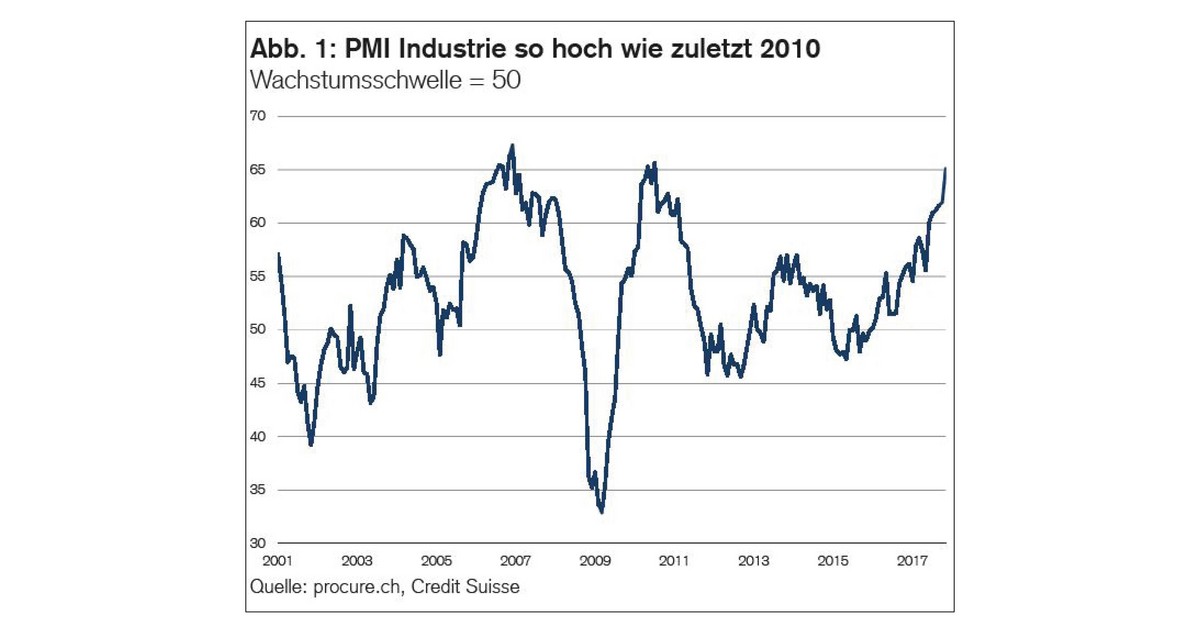 Im November stieg der procure.ch Purchasing Managers’ Index (PMI) um 3.2 Punkte und schloss auf einem Stand von 65.1 Zählern. Damit notierte er weit in der Wachstumszone und auf dem höchsten Stand seit Juli 2010 (vgl. Abb. 1). Ein derart hoher PMI-Wert wurde bisher nur in zwei Phasen verzeichnet, nämlich in der Reindustrialisierung (2005 – 2008) und im Erholungsboom (2010 – 2011). Selbst im Tech-Boom (1999 – 2000) lag der PMI unter dem derzeitigen Niveau.