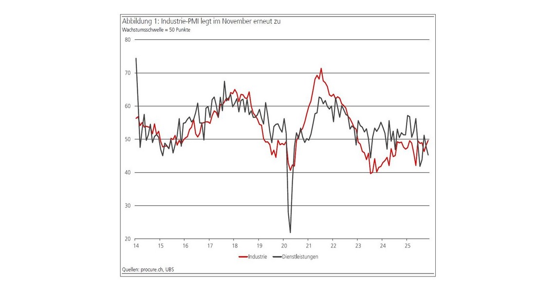 Der procure.ch Einkaufsmanagerindex (PMI) stieg im November um 1,5 auf 49,7 Punkte und notiert damitnur noch marginal unterhalb der Wachstumsschwelle. Der Rückgang des PMI für den Dienstleistungssektor setzte sich im November fort. Er fiel von 47,8 auf 45,3 Punkte. Nach der grundsätzlichen Einigung der Schweiz und der USA auf ein Zollabkommen erwarten nur noch rund 24 Prozent der befragten Unternehmen eine Zunahme des Protektionismus in den nächsten zwölf Monaten, nachdem es im Oktober noch mehr als 40 Prozent waren.