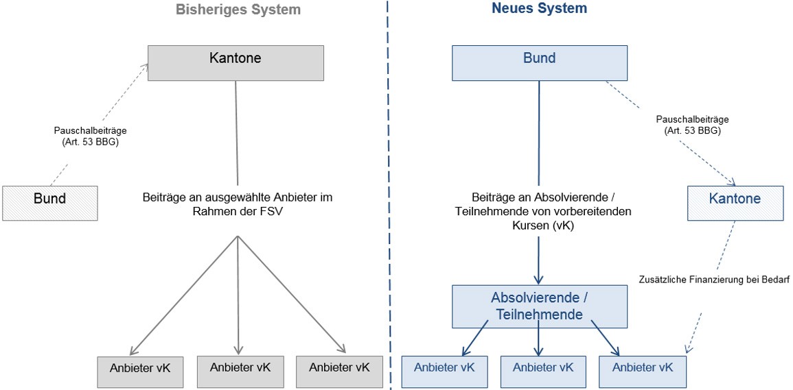 Im Eidgenössischen Departement für Wirtschaft, Bildung und Forschung WBF wurde ein Massnahmenpaket zur Stärkung der höheren Berufsbildung erarbeitet. Dazu gehört eine stärkere finanzielle Unterstützung von Absolvierenden von vorbereitenden Kursen für eidgenössische Berufsprüfungen und eidgenössische höhere Fachprüfungen.